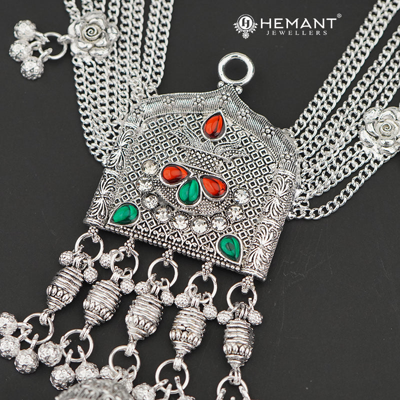 Unit price perThis exquisitely handcrafted mekhala features a majestic floral-engraved central pendant adorned with sparkling white stones, and red-green glass detailing. The broad motif is surrounded by fine filigree work and is suspended on multiple interwoven silver chains, giving it a regal flair. This piece is further embellished with dangling beads and floral side panels, creating a rhythmic movement as you walk.