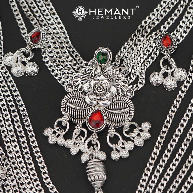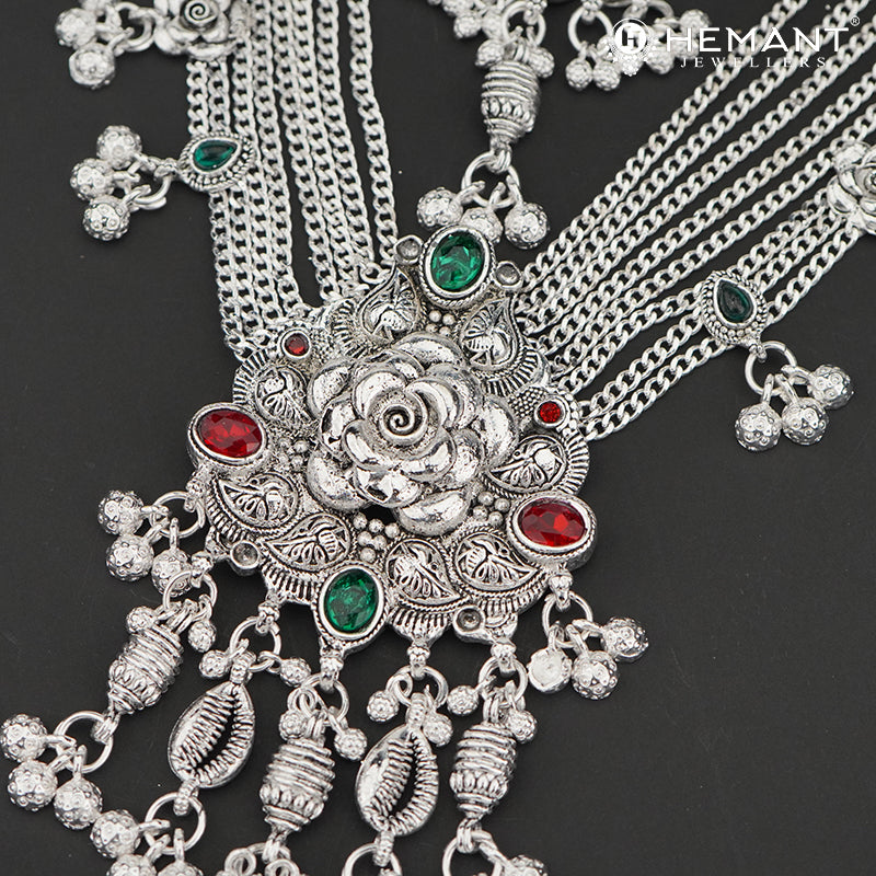 Unit price perThis exquisitely handcrafted mekhala features a majestic floral-engraved central pendant adorned with sparkling white stones, and red-green glass detailing. The broad motif is surrounded by fine filigree work and is suspended on multiple interwoven silver chains, giving it a regal flair. This piece is further embellished with dangling beads and floral side panels, creating a rhythmic movement as you walk.