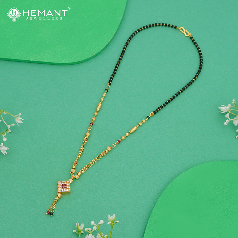 This mangalsutra is designed to stand out with its bold geometric styling and traditional essence. The chain is crafted with alternating black beads, golden textured beads, and red stone highlights that add a vibrant touch. The centerpiece is a distinctive square pendant encrusted with sparkling stones and a ruby-colored centerpiece, giving it a regal appeal.