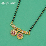 This mangalsutra is a striking blend of modern style and timeless symbolism, featuring a dual coin-inspired pendant adorned with ruby red stones, green accents, and shimmering CZ embellishments. The central alignment of motifs with floral-inspired settings adds elegance, while the sparkling detailing gives it a festive richness.