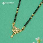 This designer mangalsutra is a perfect fusion of tradition and modernity. The black beads are paired with golden elements, creating a classic contrast that symbolizes marital elegance. Its centerpiece is a gracefully designed V-shaped pendant with cutwork patterns, crystal inlay, and a delicate dangler drop that adds sparkle and movement.