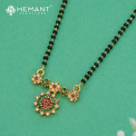 This mangalsutra brings together timeless tradition and modern artistry through its multi-floral pendant cluster. The centerpiece features a round floral design crafted with green and ruby-red stones, enhanced by shimmering white accents, creating a dazzling harmony of colors. Smaller floral motifs on either side add depth and elegance, making it a standout design.