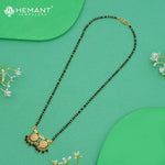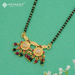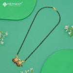 This mangalsutra blends grace and charm with its radiant floral sunburst pendant. The centerpiece is adorned with ruby-red and green CZ stones, surrounded by shimmering white accents that highlight its festive beauty. Its intricate circular design brings a sense of balance and prosperity, making it a timeless choice for daily wear as well as special occasions.