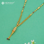 This mangalsutra combines timeless tradition with detailed craftsmanship. The black bead chain is interspersed with golden textured beads and ruby-toned stone highlights, giving it a rich and festive appeal. At the center rests a cylindrical pendant adorned with intricate detailing, sparkling stone inlays, and delicate golden chains ending in colorful bead drops.