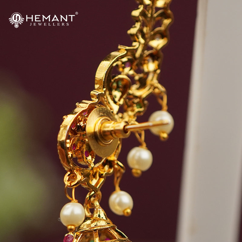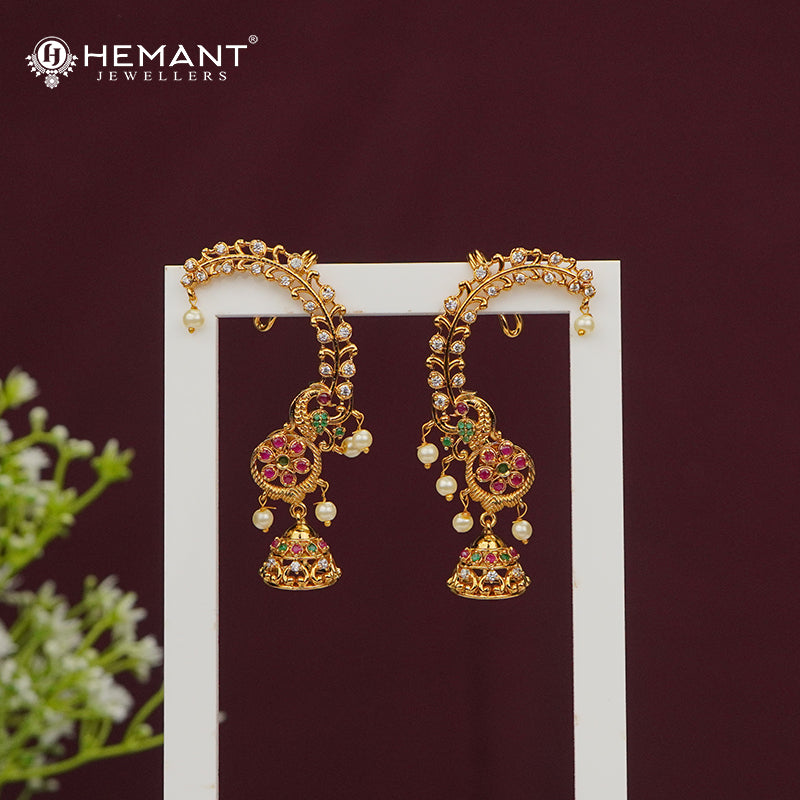 Add a regal charm to your festive or bridal look with this intricately crafted gold-plated earcuff, also known as Kan in Marathi. Designed with a beautiful vine-like curve, it is adorned with sparkling multicolour stones and graceful pearl danglers that sway with every movement.
