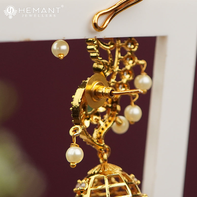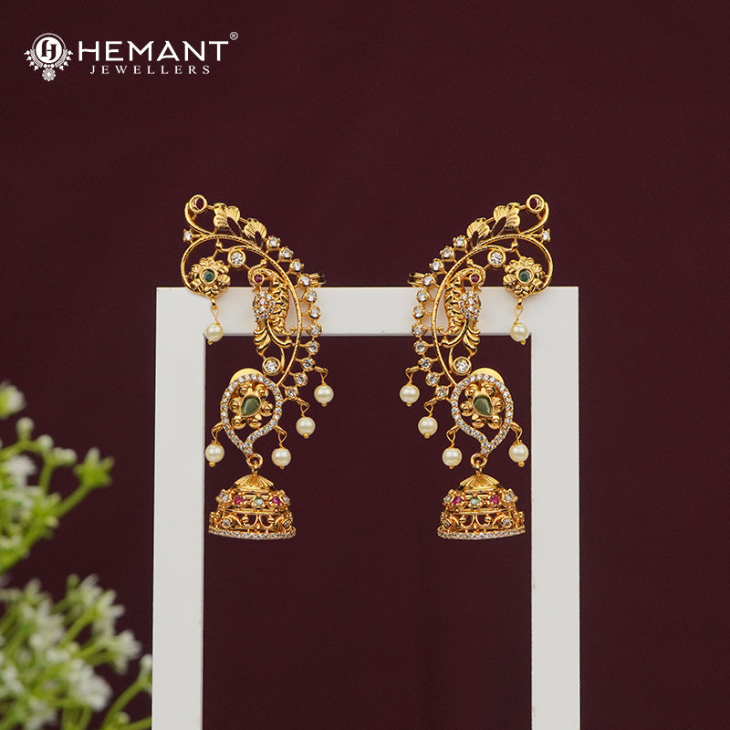 Add a regal charm to your festive or bridal look with this intricately crafted gold-plated earcuff, also known as Kan in Marathi. Designed with a beautiful vine-like curve, it is adorned with sparkling multicolour stones and graceful pearl danglers that sway with every movement.