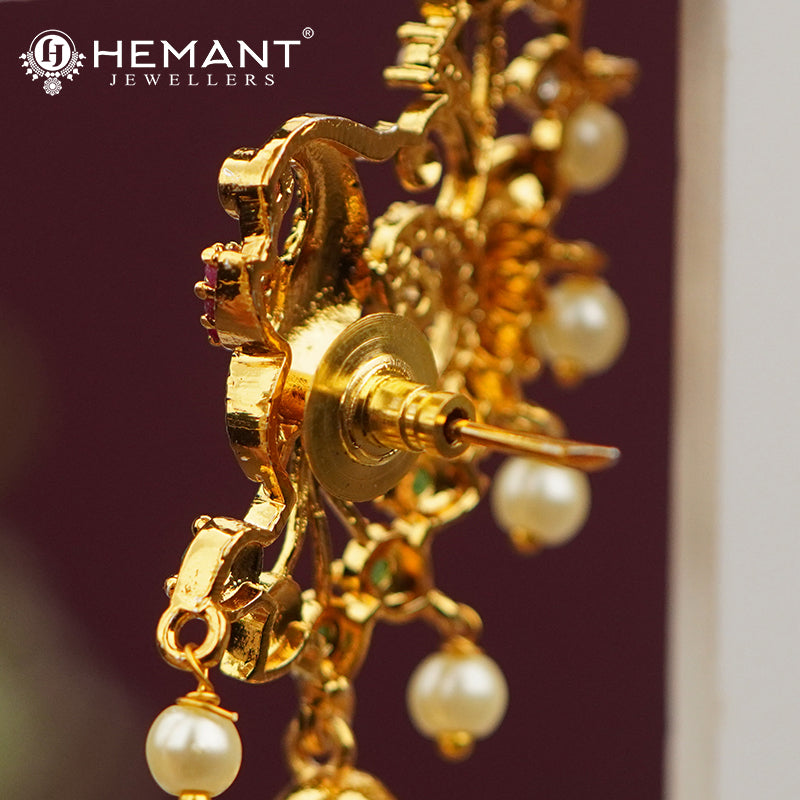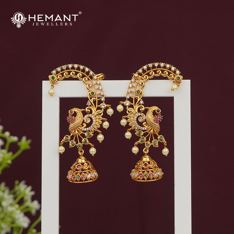 Add a regal charm to your festive or bridal look with this intricately crafted gold-plated earcuff, also known as Kan in Marathi. Designed with a beautiful vine-like curve, it is adorned with sparkling multicolour stones and graceful pearl danglers that sway with every movement.