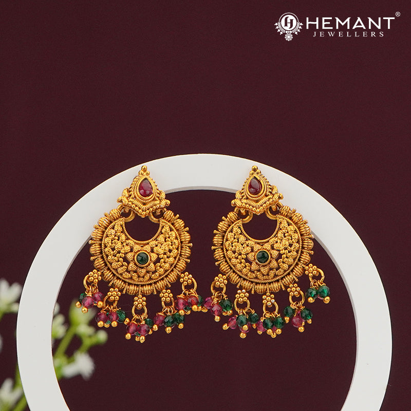 Unit price perStep into timeless elegance with these antique-style chandbali earrings from Hemant Jewellers. Featuring a crescent moon design adorned with fine filigree patterns and centered with a green stone, these earrings are further enhanced by red and green hanging beads that add vibrant movement and grace. A red teardrop stone on top completes the ethnic appeal. Ideal for festivals, family functions, and traditional attire.