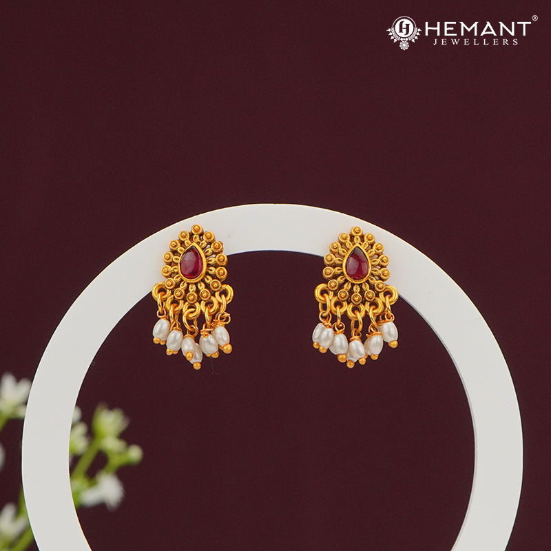 Unit price perCelebrate ethnic elegance with these charming Maharashtrian-style earrings from Hemant Jewellers. Designed in an antique gold finish, the earrings feature a prominent red teardrop stone at the center, framed by intricate detailing. White pearl danglers add a touch of delicacy and movement, making them perfect for traditional functions, festive events.