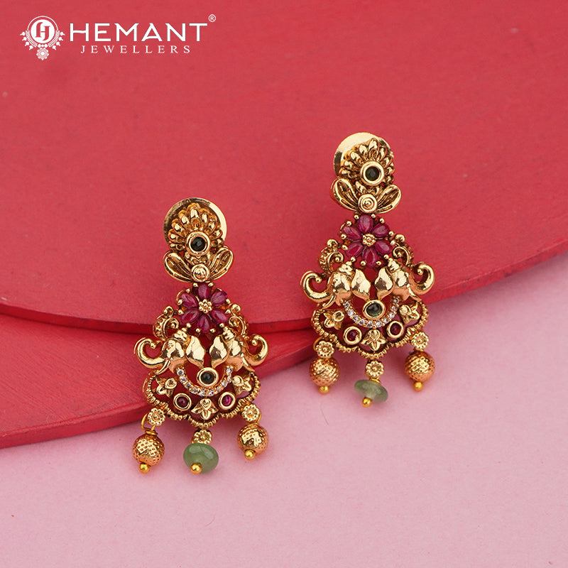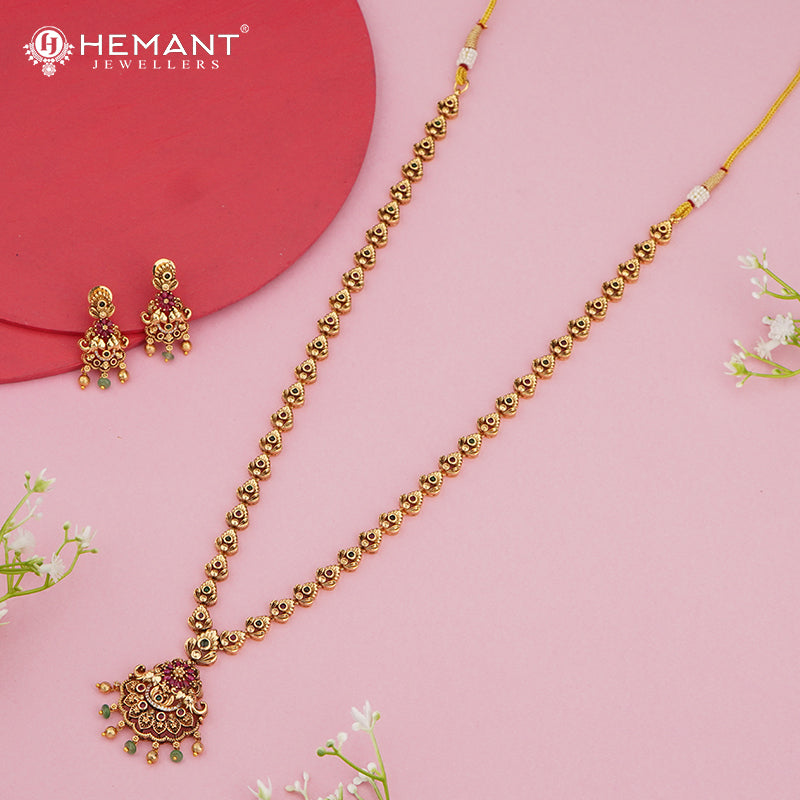 Exuding grandeur and ornamental richness, this antique-finish necklace set by Hemant Jewellers highlights intricate temple artistry with a modern twist. The chain is composed of floral-motif links with ruby accents and hints of green enamel, maintaining a consistent and regal aesthetic.