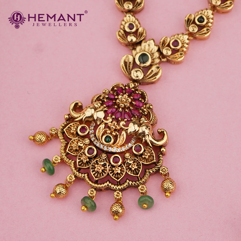 Unit price perA heritage-style antique necklace set featuring elephant engravings and a floral pendant with ruby-green detailing.