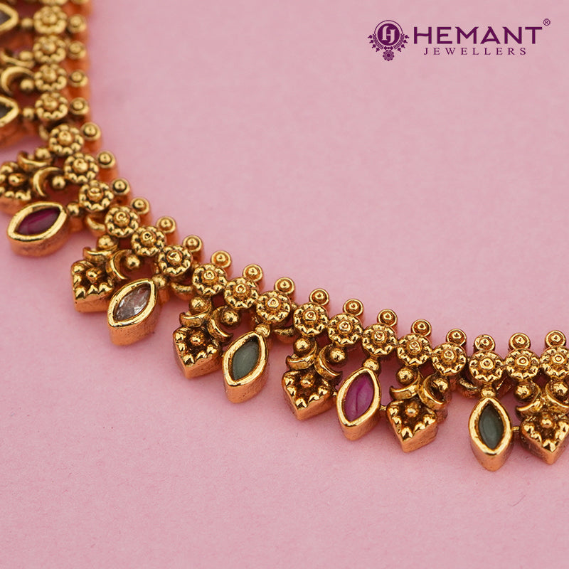 Antique Finish Delicate Petal Motif Necklace Set with Multicolor Stone Drops – 4617