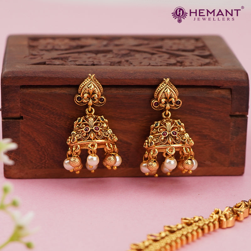 Its lightweight yet ornate pattern makes it ideal for pairing with both sarees and lehengas, while the matching jhumka-style earrings complete the coordinated traditional look.