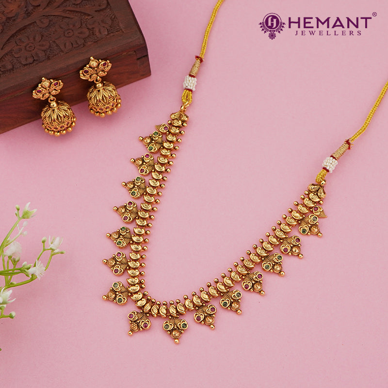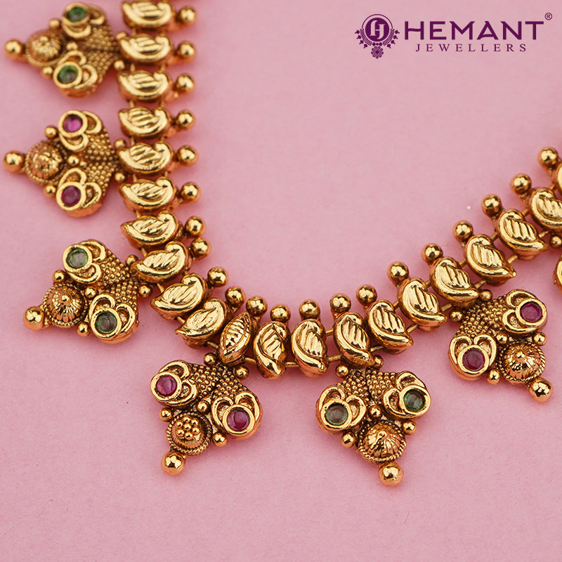 Celebrate timeless Maharashtrian aesthetics with this antique-finish necklace set from Hemant Jewellers. Designed with alternating carved leaf elements and delicately placed green and red round stones, this piece evokes vintage charm with a touch of modern detailing. The symmetrical layout adds a rhythmic elegance to the design, making it suitable for festive as well as ethnic casual wear.