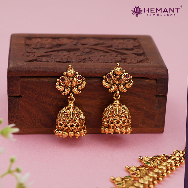 The set includes beautifully coordinated jhumka-style earrings that echo the necklace’s antique appeal and feature traditional patterns with fine craftsmanship.