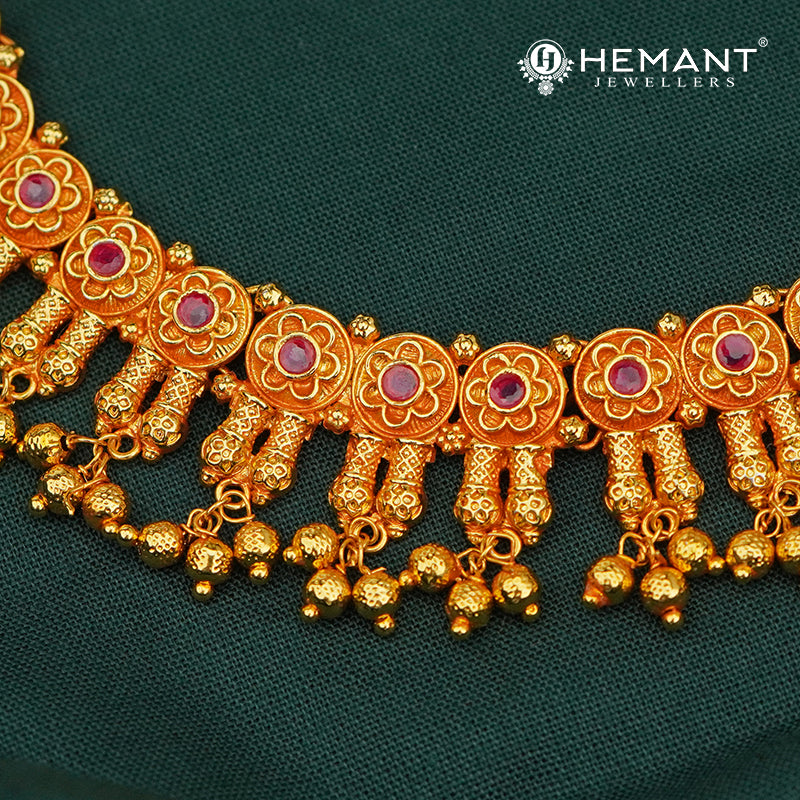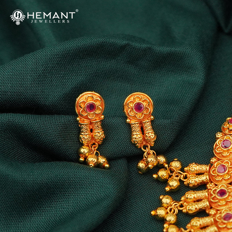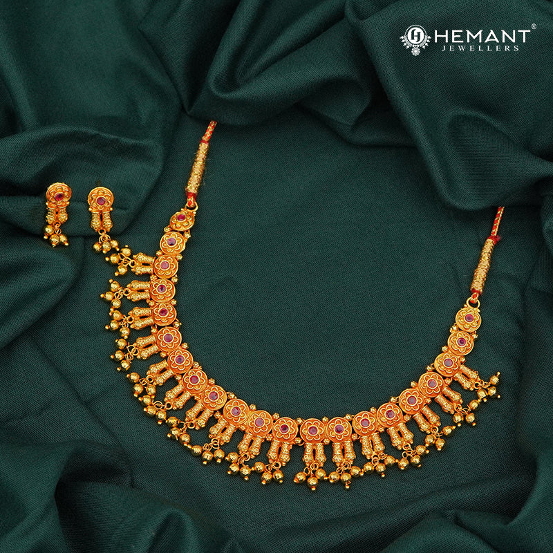 This graceful antique-finish necklace set blends traditional artistry with vibrant detailing. The necklace features a row of circular floral motifs, each crafted with intricate pink enamel work and bordered by gold accents. Hanging from each floral segment are delicately designed gold-tone danglings, adorned with tiny bead clusters, adding a rhythmic movement to the design.