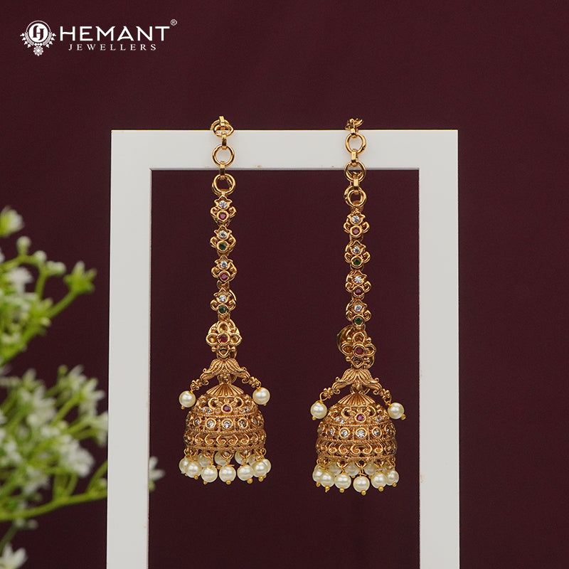 This Antique-Finish Earcuff (Kan) showcases a long, cascading floral-link chain that elegantly frames the ear. Each floral element is studded with multicolor stones, leading to intricately designed dome-shaped jhumkas adorned with delicate pearl drops.
