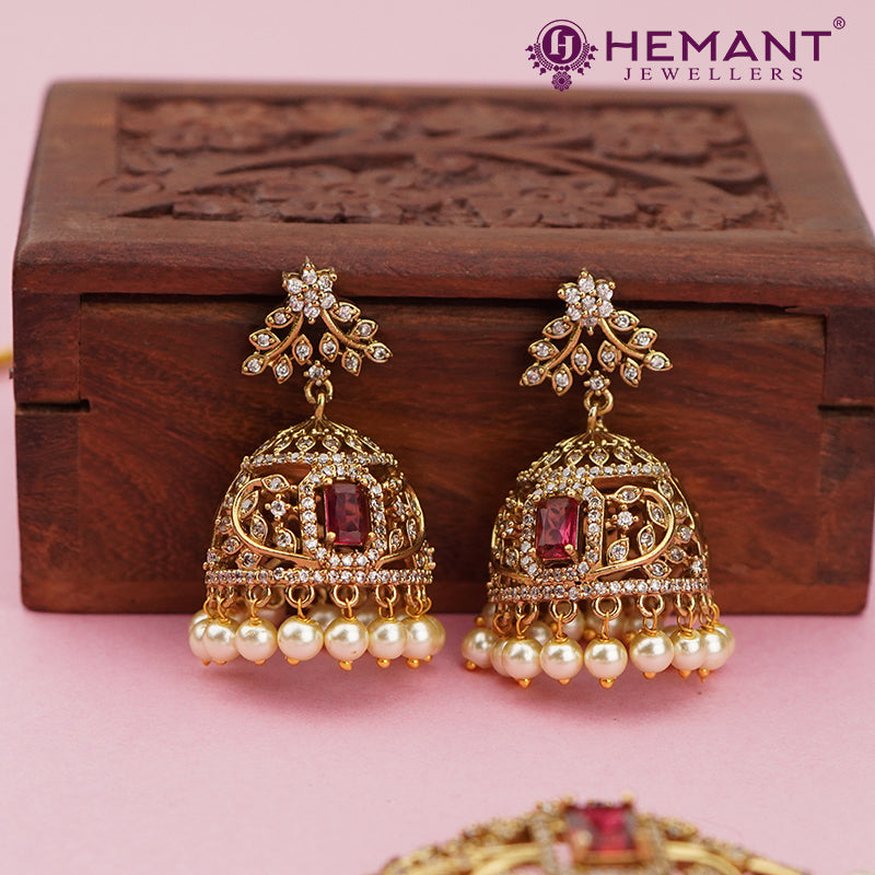 A refined blend of grace and grandeur, this antique-finish necklace set from Hemant Jewellers showcases an exquisite centerpiece that immediately captures attention. The necklace features three strands of lustrous imitation pearls on each side, gracefully converging at a regal floral pendant. The centerpiece is adorned with a bold ruby-hued stone surrounded by finely detailed leafy vines studded with shimmering white stones, adding depth and brilliance.