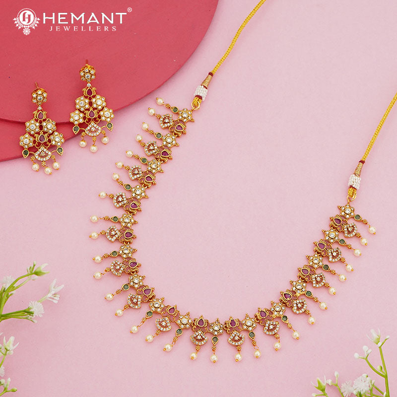 Unit price perA traditional bridal necklace set adorned with ruby-green stones, pearl danglers, and temple-style motifs.