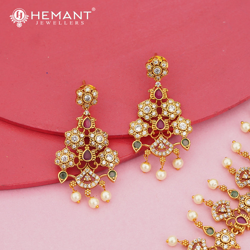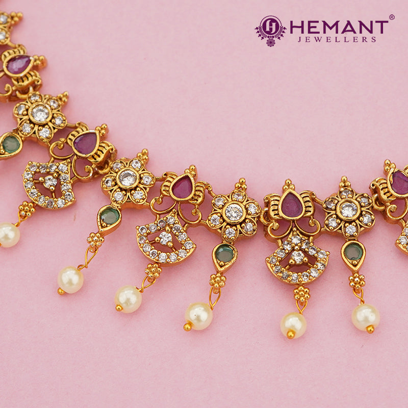 Celebrate timeless elegance with this exquisite antique-finish necklace set, inspired by South Indian temple jewelry aesthetics. Crafted with intricate design elements, the necklace showcases floral and mango motifs embellished with red and green stones, complemented by delicate pearl danglers that add movement and grace.