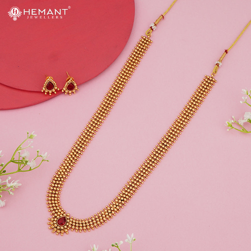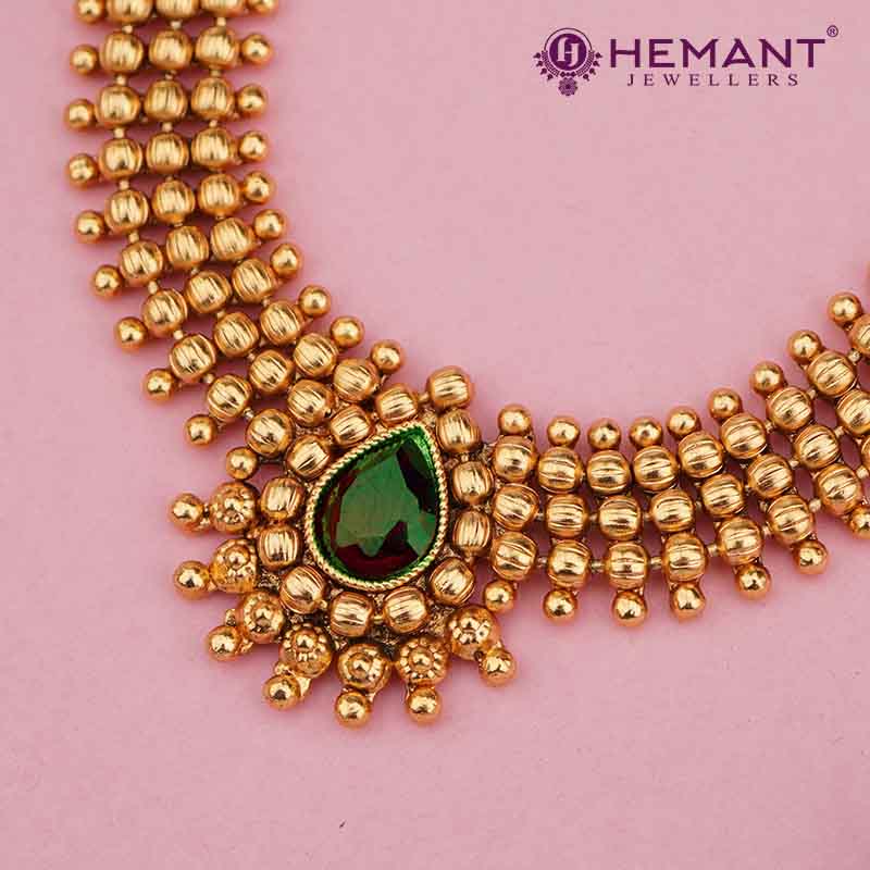This design blends timeless appeal with simplicity, making it ideal for everyday elegance or graceful festive dressing. Whether worn solo or layered with chokers, it seamlessly complements sarees, paithanis, or traditional navaris.