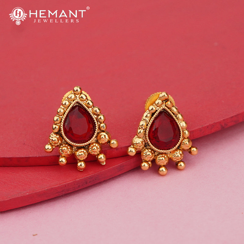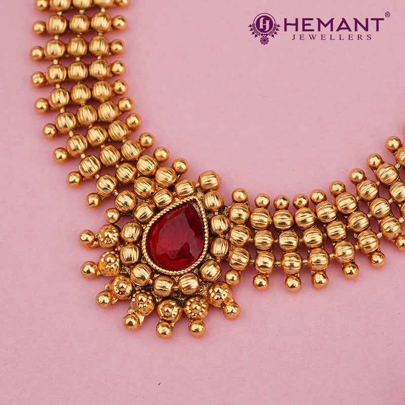 Add a regal touch to your ethnic attire with our Traditional Beaded Necklace Set. Crafted in a layered three-line bead design, this piece reflects the finesse of traditional Maharashtrian craftsmanship. The centerpiece features a teardrop-shaped red stone embellished with a halo of golden drops, perfectly echoed in the matching earrings.