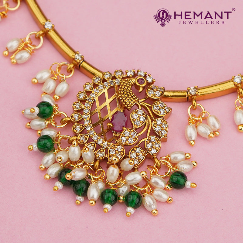 This stunning designer necklace set features a striking peacock motif at its centerpiece, enclosed within an ornate floral framework studded with sparkling white stones. The semi-circular pendant is adorned with intricate cutwork and lattice-style detailing, complemented by cascading pearl clusters and green bead drops, enhancing its regal look. The sides of the necklace are designed with smooth gold-tone cylindrical rods, each segment accented with tiny pearl charms for rhythmic elegance.