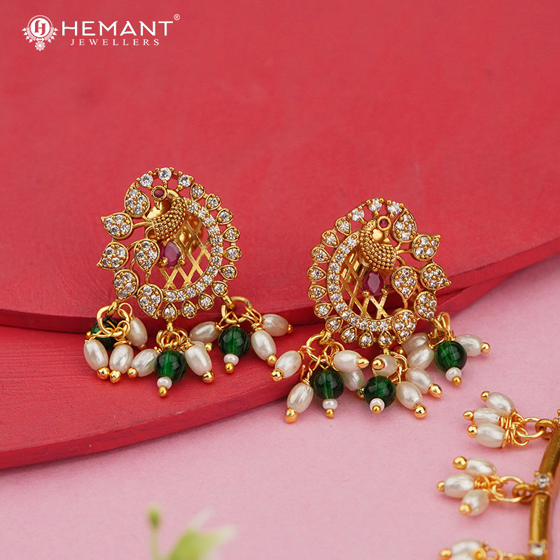 Antique Finished Peacock Pendant Necklace Set with Pearl & Green Bead Hangings – 4596-97
