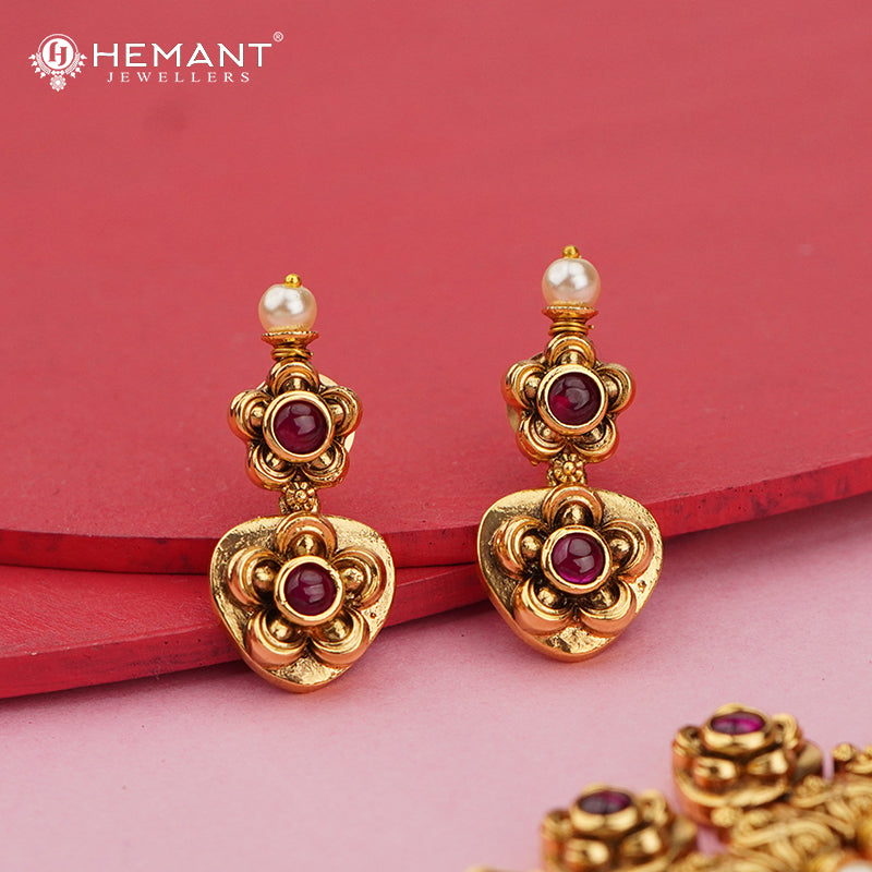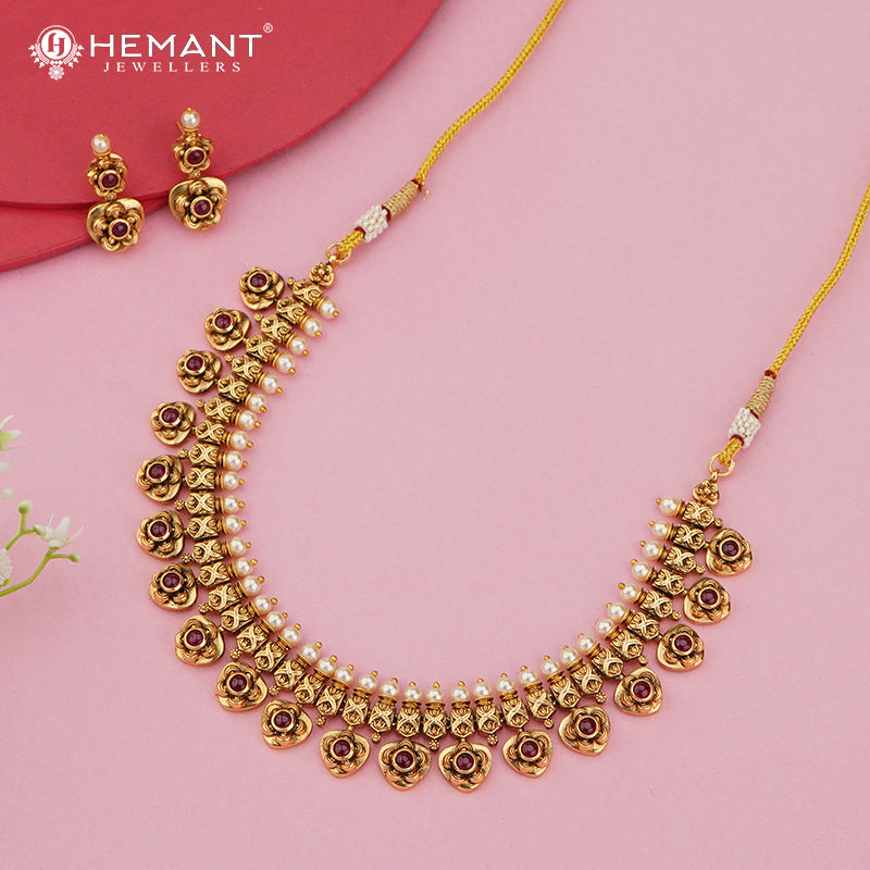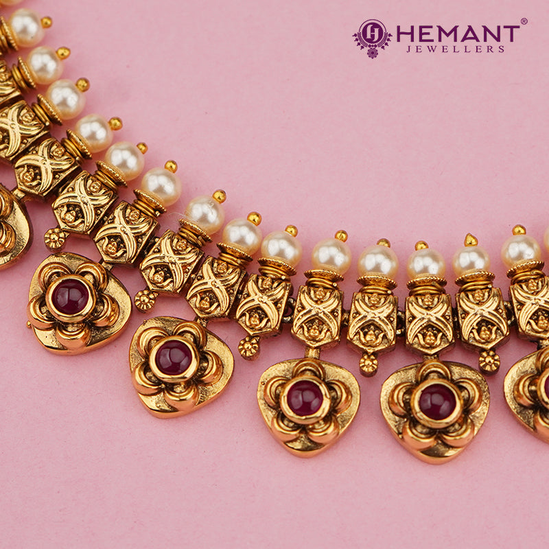 This exquisitely crafted antique necklace set is a true celebration of traditional artistry, featuring intricate floral motifs set on heart-shaped panels. Each flower is centered with a ruby-toned stone, complemented by a graceful border of small antique textured links and a fringe of pearl bead drops that add rhythm and movement to the design.