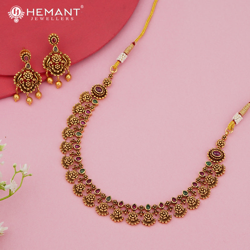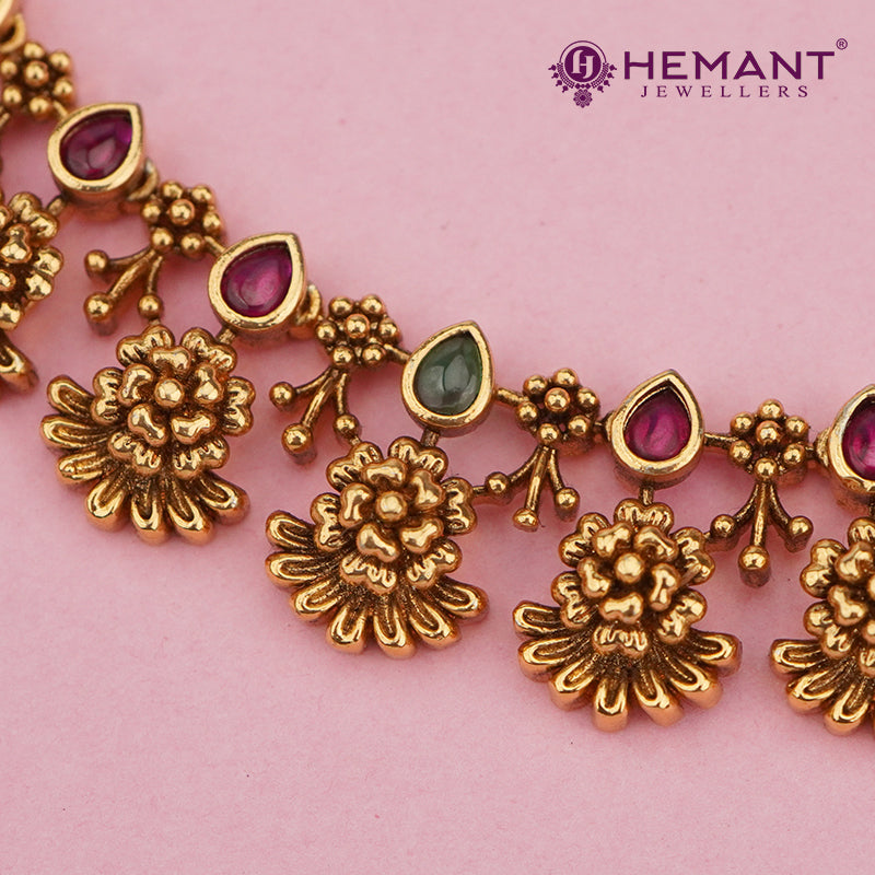 Celebrate timeless elegance with this antique-finish necklace set that blossoms with floral artistry and regal charm. The necklace is designed with an alternating sequence of delicately carved layered flowers and pear-shaped ruby-green stones, each framed with tiny engraved buds. The balanced design creates a cascading jhalar effect, adding both movement and symmetry to your neckline.