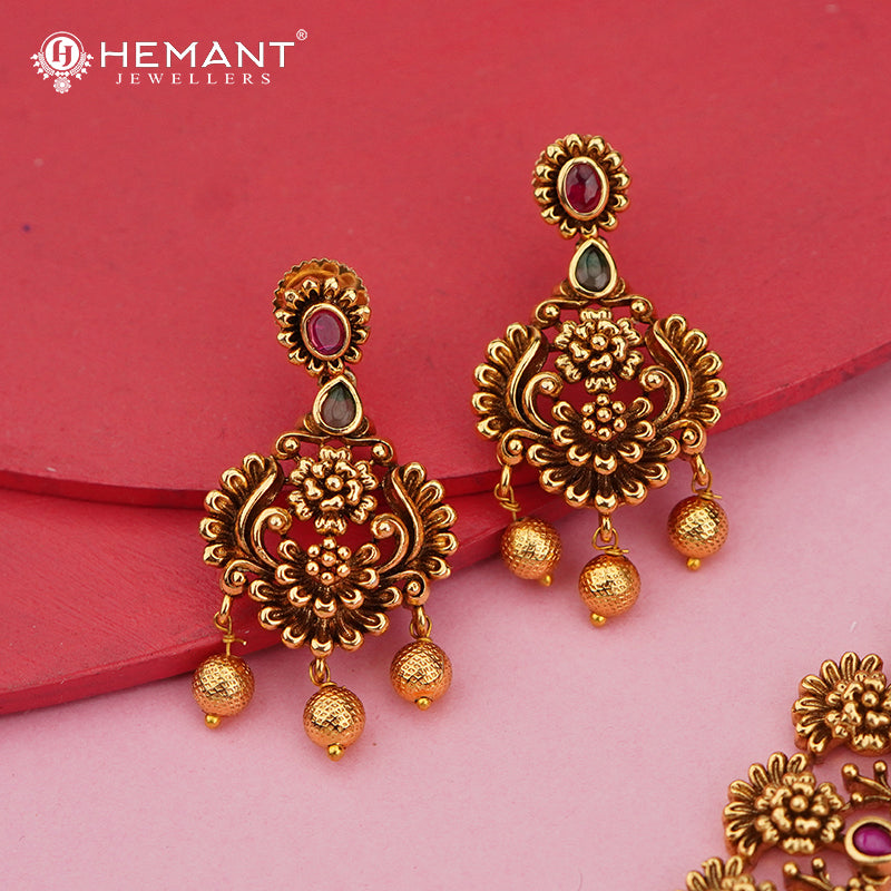 A stunning pair of matching earrings with bold floral tops and drop accents complete the set, making it ideal for special occasions where you want to stand out with refined grace. The matte antique gold tone enhances the depth of the carvings, while the touch of ruby and green adds richness and contrast.