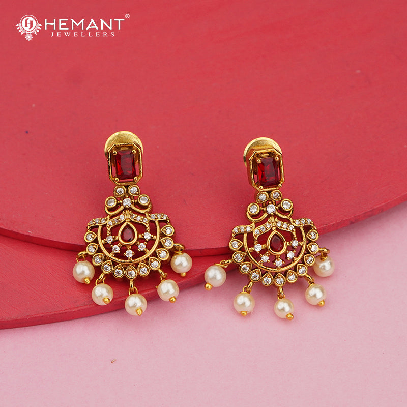 This bridal necklace set showcases timeless grace with a bold centerpiece that draws attention to the neckline. The antique gold-finish frame is enhanced with rich red rectangular stones, each bordered with delicate white stones. The centerpiece pendant, adorned with a teardrop ruby-colored stone and encircled by dazzling white stones, gives it a striking traditional finish.