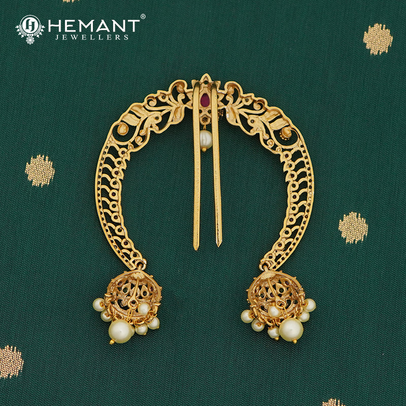 Dangling at both ends are intricately carved jhumki drops adorned with pearls, adding regal movement and charm to your bridal or festive hairstyle. The sturdy dual-pin fitting ensures this piece stays firmly placed in traditional hair buns.