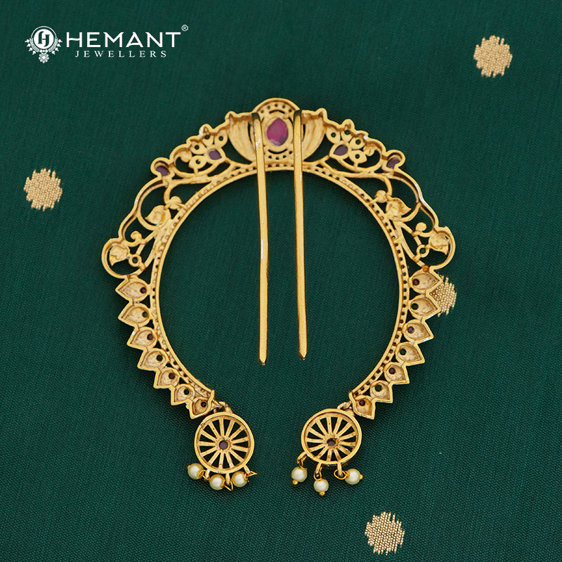 The curved frame is embellished with dazzling AD stones and traditional scale-leaf patterns, creating a perfect arch that sits beautifully over a bun. The standout element is the chakra-inspired jhumkis at the ends, finished with pearl dangles that sway gracefully with every movement.