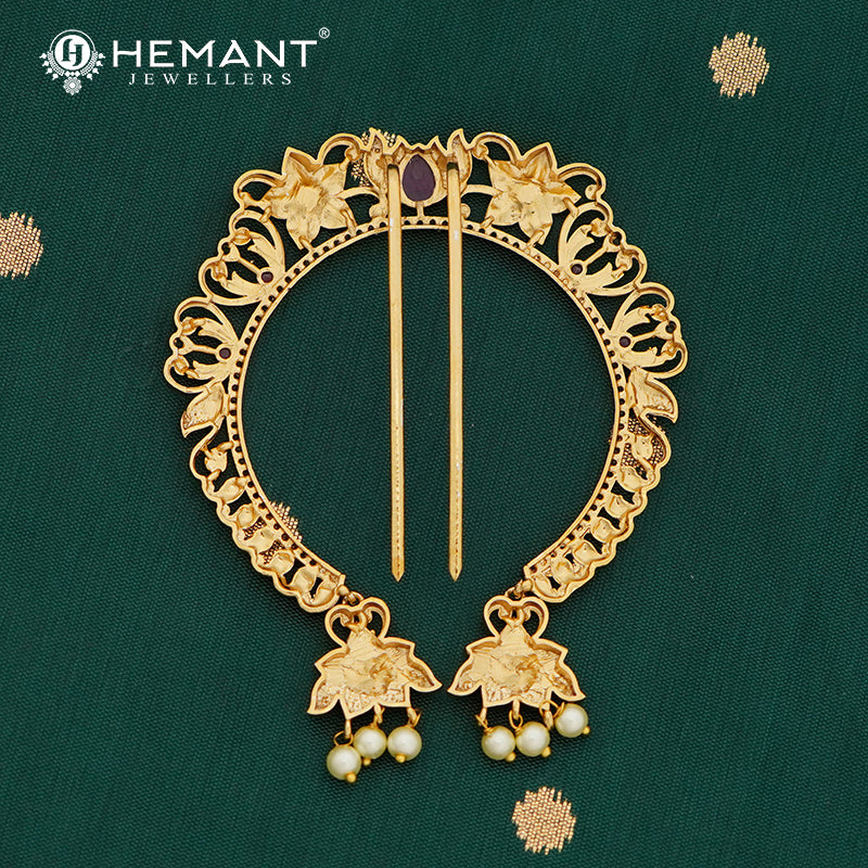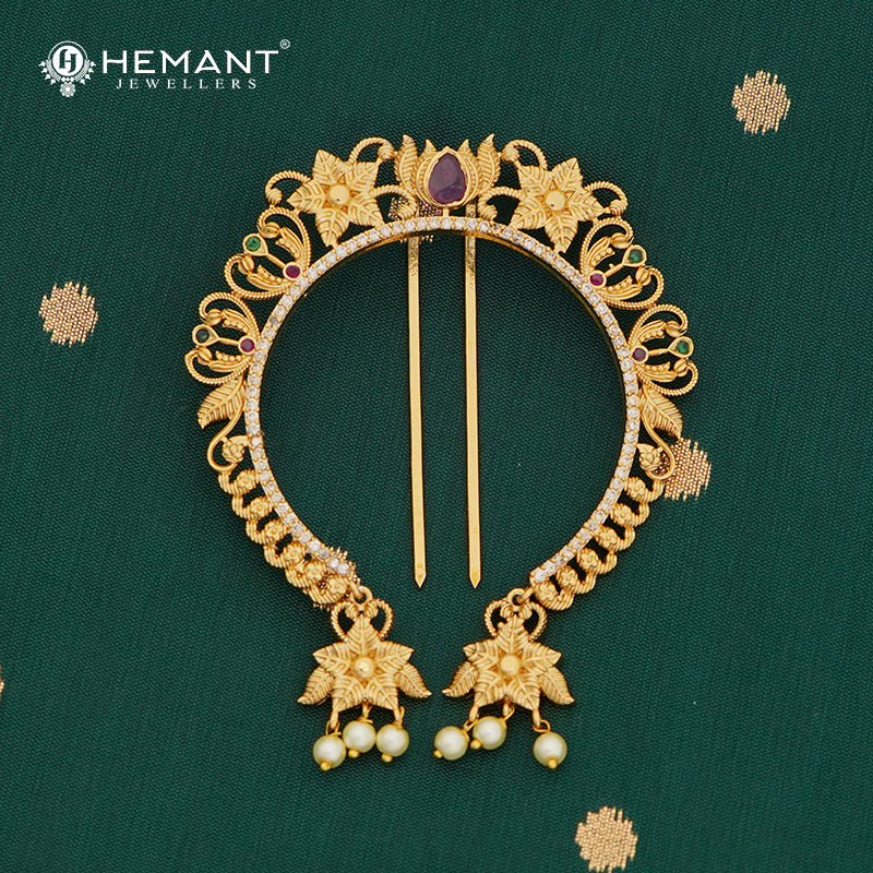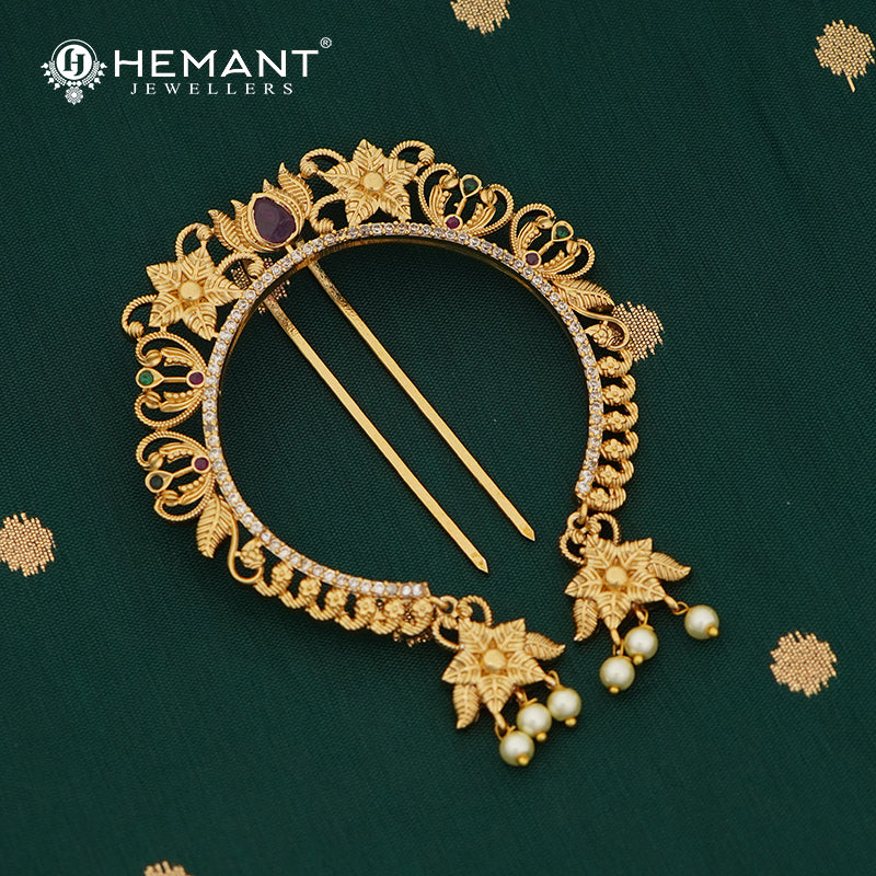 This ambada, also referred to as a hair brooch or hair pin, is a beautiful representation of traditional Maharashtrian hair jewellery. The arched frame is gracefully adorned with lotus motifs, delicate nakshi-style floral elements, and leaf-inspired curves accented with kundan-like stones.
