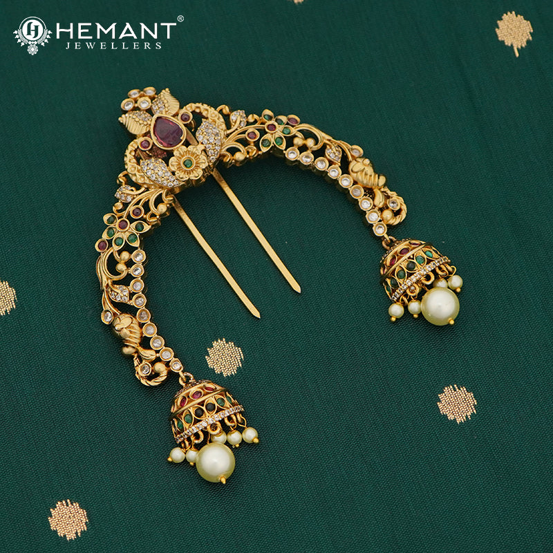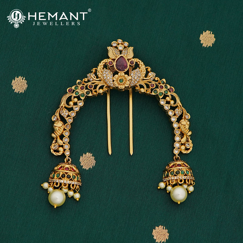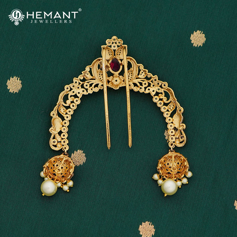 This designer ambada, also called a hair pin or hair brooch, is an elegant blend of traditional Maharashtrian style and detailed craftsmanship. The top features a teardrop ruby centerpiece, highlighted by surrounding CZ stones and floral leaf patterns in matte gold.