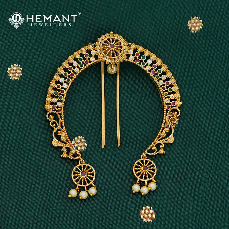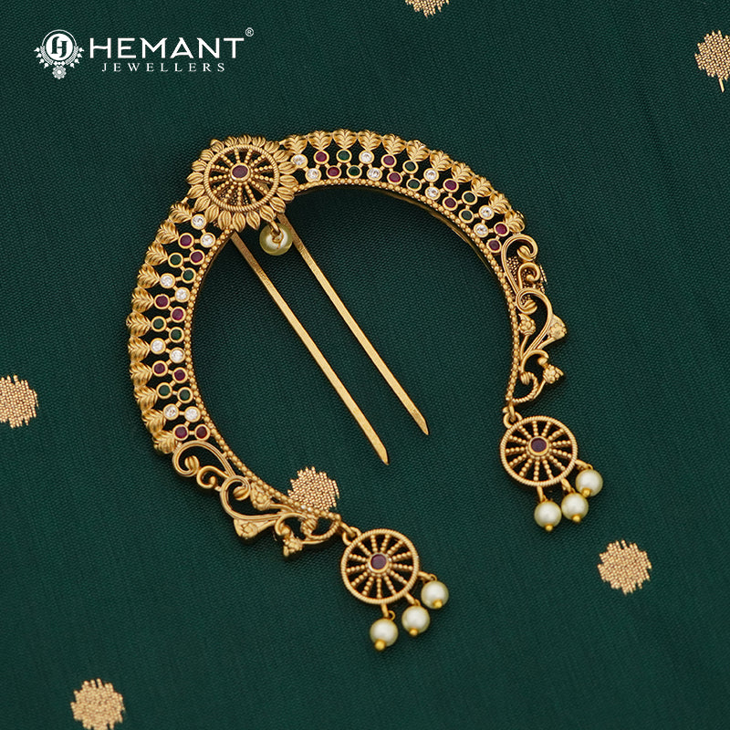 This beautifully crafted ambada (hair pin / hair brooch) showcases timeless Maharashtrian artistry, ideal for completing your festive or bridal look. The semi-circular arc is intricately detailed with alternating red, green, and white stones, each nestled within engraved lotus motifs – a nod to divine femininity and auspicious beginnings.