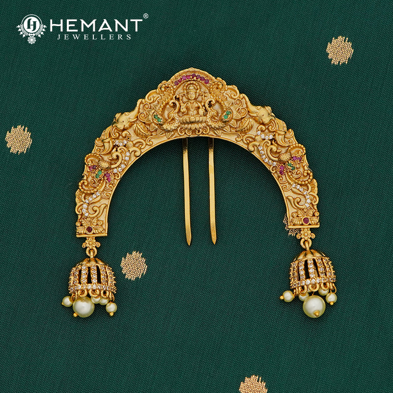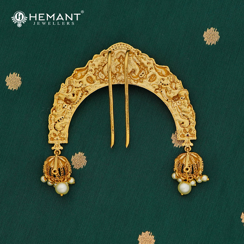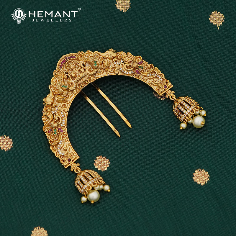 Crafted with sacred artistry, this temple-inspired ambada (hair brooch) is a symbol of tradition and spirituality. The centerpiece features an engraved Goddess Laxmi seated in a blessing posture, flanked by graceful peacocks and intricate foliage carvings across the arch.