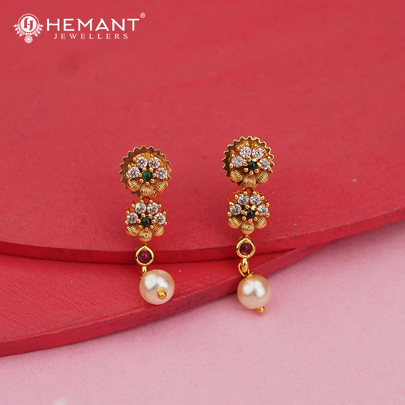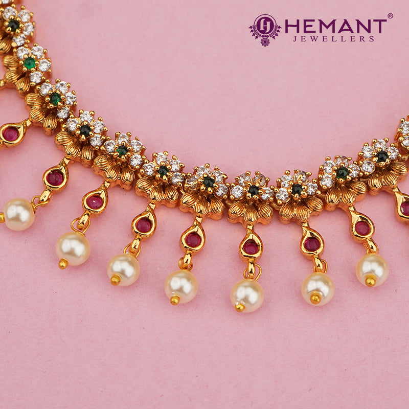 Unit price perThis antique-finish necklace set captures the essence of South Indian temple artistry. The standout feature lies in the alternating disc-shaped drops—meticulously encrusted with ruby, green, and white stones—suspended from a base of traditional floral and yali-inspired motifs. Every detail, from the beaded accents to the structured gold work, adds depth and heritage to the piece.