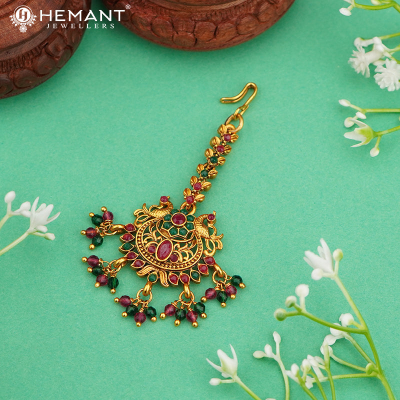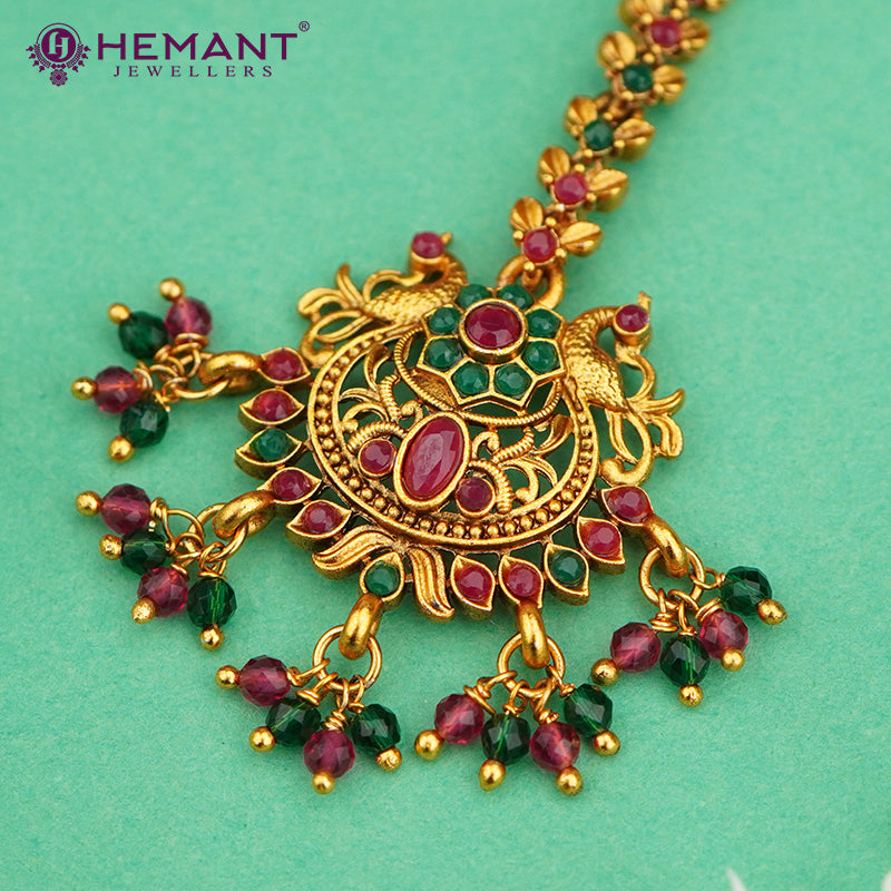 Unit price perAdorn your forehead with this Antique Tikka, a symbol of grace and beauty. Crafted from a durable copper alloy, it's embellished with synthetic stones and beads. The design exudes a vintage charm, making it a perfect accessory for traditional events. Whether attending a wedding or a festive celebration, this Tikka will enhance your ethnic look with its timeless elegance.