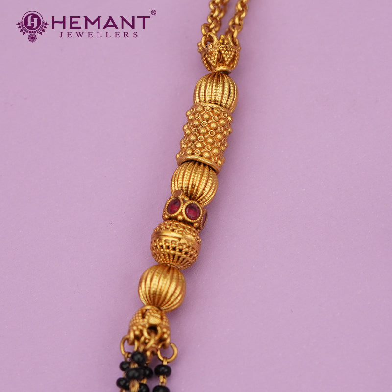A striking mangalsutra with triple-chain black beads, antique golden beads, and dual round pendants adorned with ruby stone detailing.