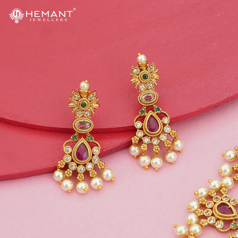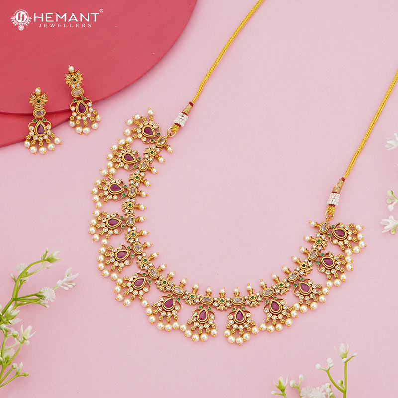 Each motif is framed with kundan and finished with multiple pearl hangings, making this set a true reflection of regal elegance. The matching drop earrings complement the necklace perfectly, creating a coordinated and festive look.