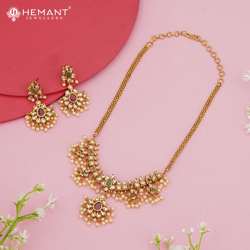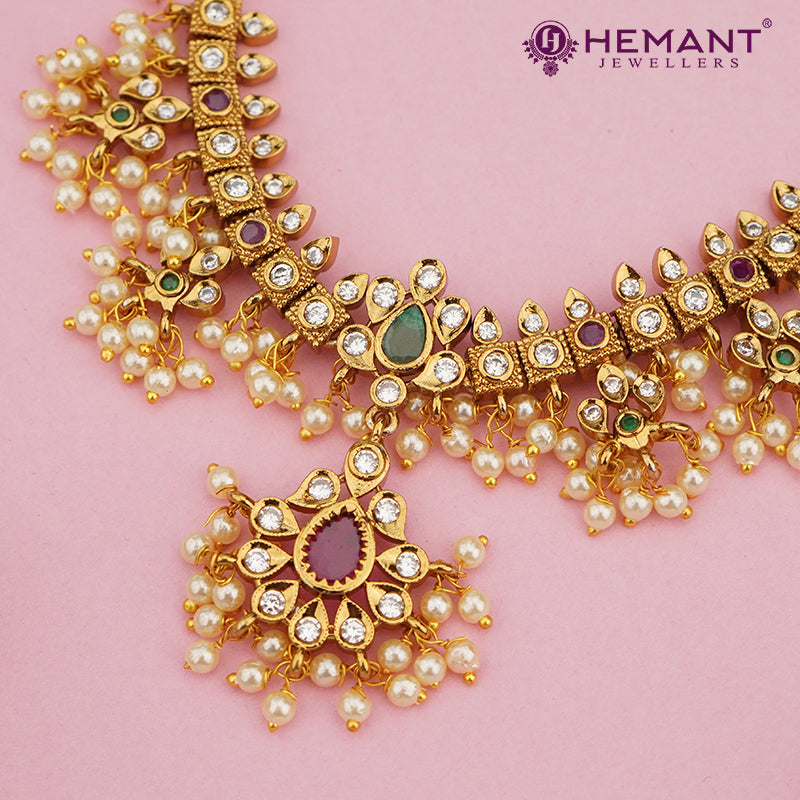 Channel timeless bridal elegance with this traditional kundan necklace set from Hemant Jewellers. Featuring a symmetrically crafted layout, the necklace flaunts red and green centerpieces surrounded by hand-set white kundan stones. Dangling faux pearl clusters add grace and movement, making it an ideal choice for ceremonial occasions.