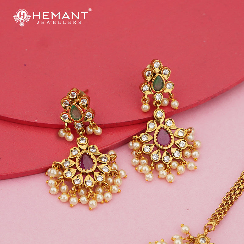 The coordinated earrings echo the same design, ensuring a complete festive look. Whether styled with a silk saree or a richly embroidered lehenga, this set will add grandeur to your ensemble.