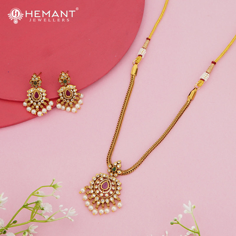 Unit price perTraditional temple-inspired pendant necklace set with pearl hangings and matching earrings.