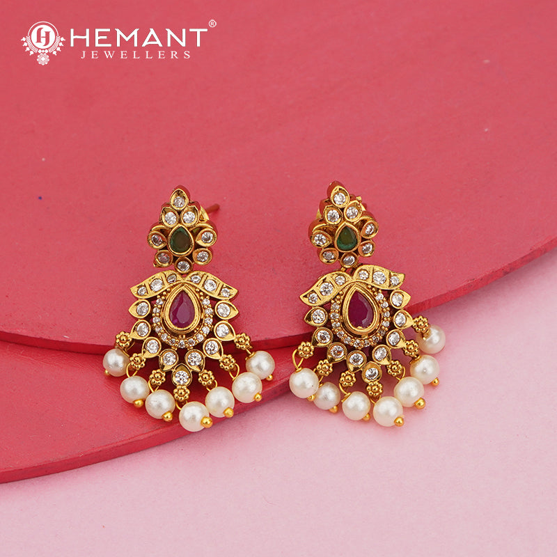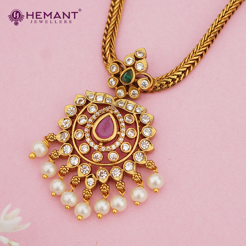 Make a grand impression with this antique-finish necklace set, crafted in a rich temple-inspired design. The highlight is the stunning central pendant adorned with shimmering white stones, a ruby-toned teardrop centerpiece, and a graceful fringe of round pearls. The ornate peacock-style top element of the pendant adds a regal temple-jewelry touch.