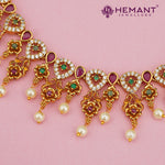 Floral Antique Necklace with Ruby-Green Stones & Pearl Drops – 4600