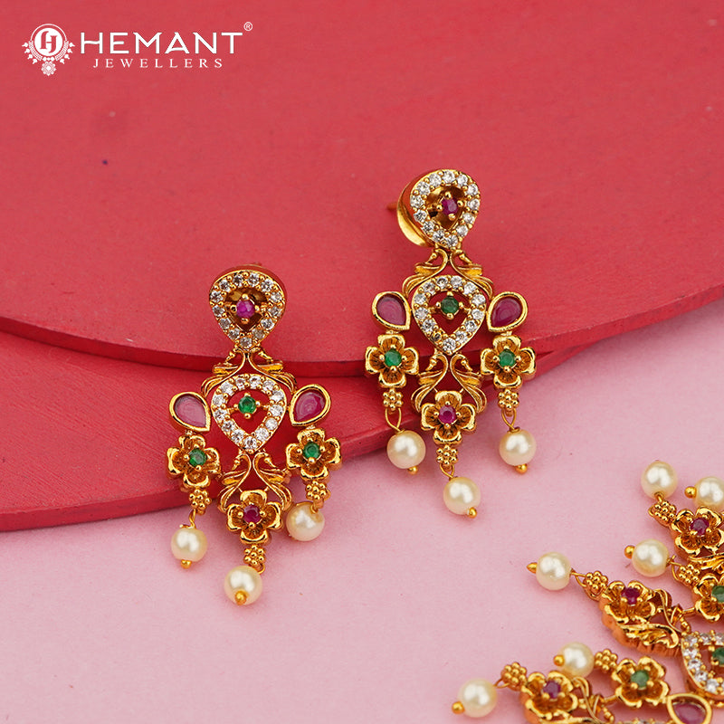 Turn heads with this vibrant floral-themed necklace set, crafted in a stunning antique gold finish. The necklace features a symmetrical arrangement of heart-shaped motifs encrusted with green stones and bordered by CZ diamonds. Complemented with delicate pink stone teardrops and intricate gold flower charms, the design brings a balanced fusion of sparkle and tradition.