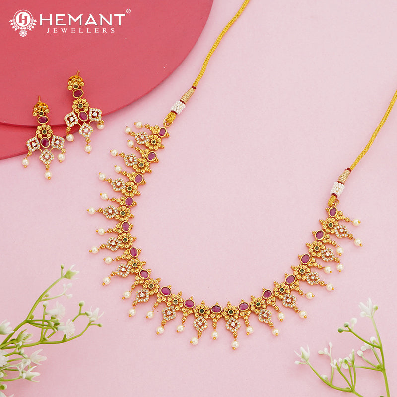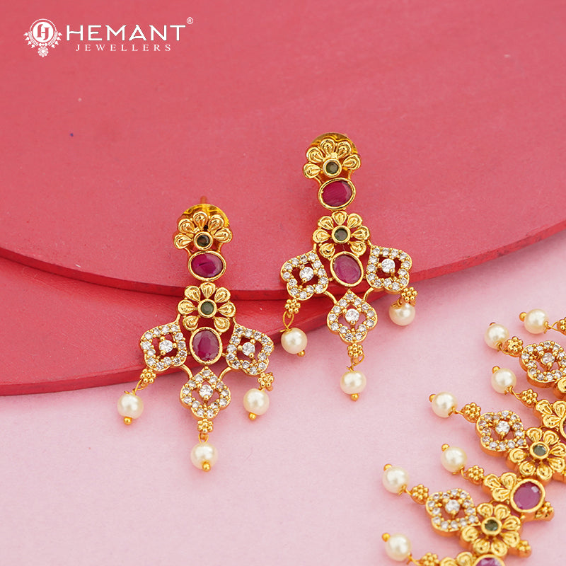 Floral Drop Antique Necklace Set with Pearl Danglers – 4645