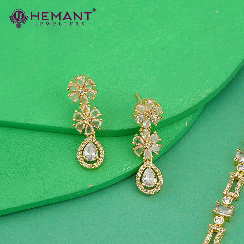 Grace your neckline with this refined floral-motif necklace set, designed in a graceful gold-finish with sparkling American Diamonds. The chain features alternating rectangular and round stone links, culminating in a delicate floral cluster adorned with a pear-shaped drop pendant. Its shimmering stones and well-balanced composition offer a contemporary edge to a classically elegant design.